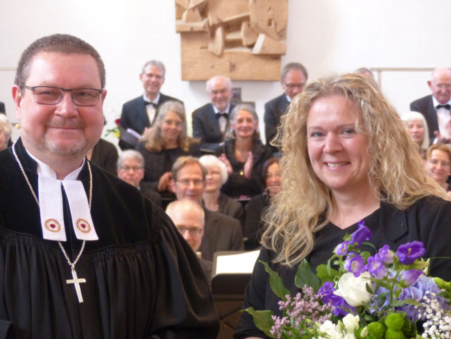 Dekan Uwe Rasp würdigte das hohe Engagement und die große Professionalität des Kantorenpaares, das auch die geistliche Dimension der Kirchenmusik, die Verkündigung und den Gemeindeaufbau immer im Blick hat und dessen Markenzeichen die in der ganzen Region bekannten Kindermusicals sind. Überregional ist Thomas Riegler auch als Komponist und Arrangeur für Orgel, Posaunenchor und Vocalensemble bekannt geworden. Trotz der pandemiebedingten Einschränkungen im Probenbetrieb ist es den beiden gelungen, mit Posaunenchor, Kinderchören und Kantorei z. B. digital weiter in Kontakt zu bleiben, wodurch die Ensembles auch nach zwei Jahren Corona noch sing- und spielfähig sind. Der gelungene Auftritt der Kantorei in diesem Gottesdienst belegte das eindrücklich, und auch ein Kindersingspiel zur Schöpfungsgeschichte wird es heuer Ende Juni in der Stadthalle geben.